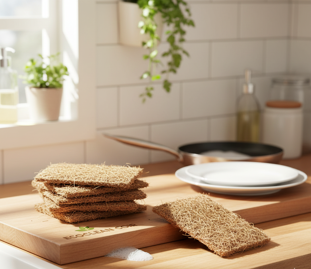 100% biodegradable coconut coir scrubber. Chemical-free, plastic-free, and safe for you and the environment.
