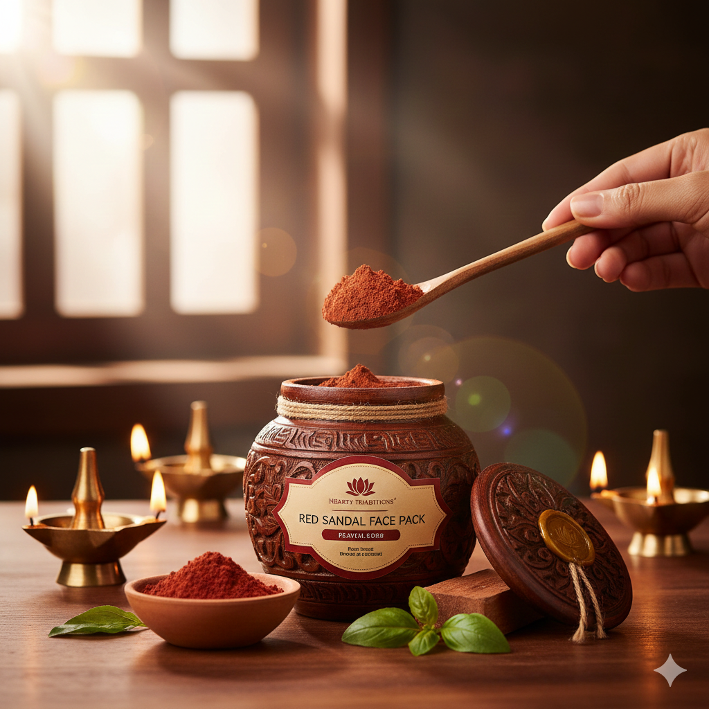 “A soothing sandal face pack that cools, tones, and brightens the skin while helping to reduce blemishes and excess oil for a natural, healthy glow.”