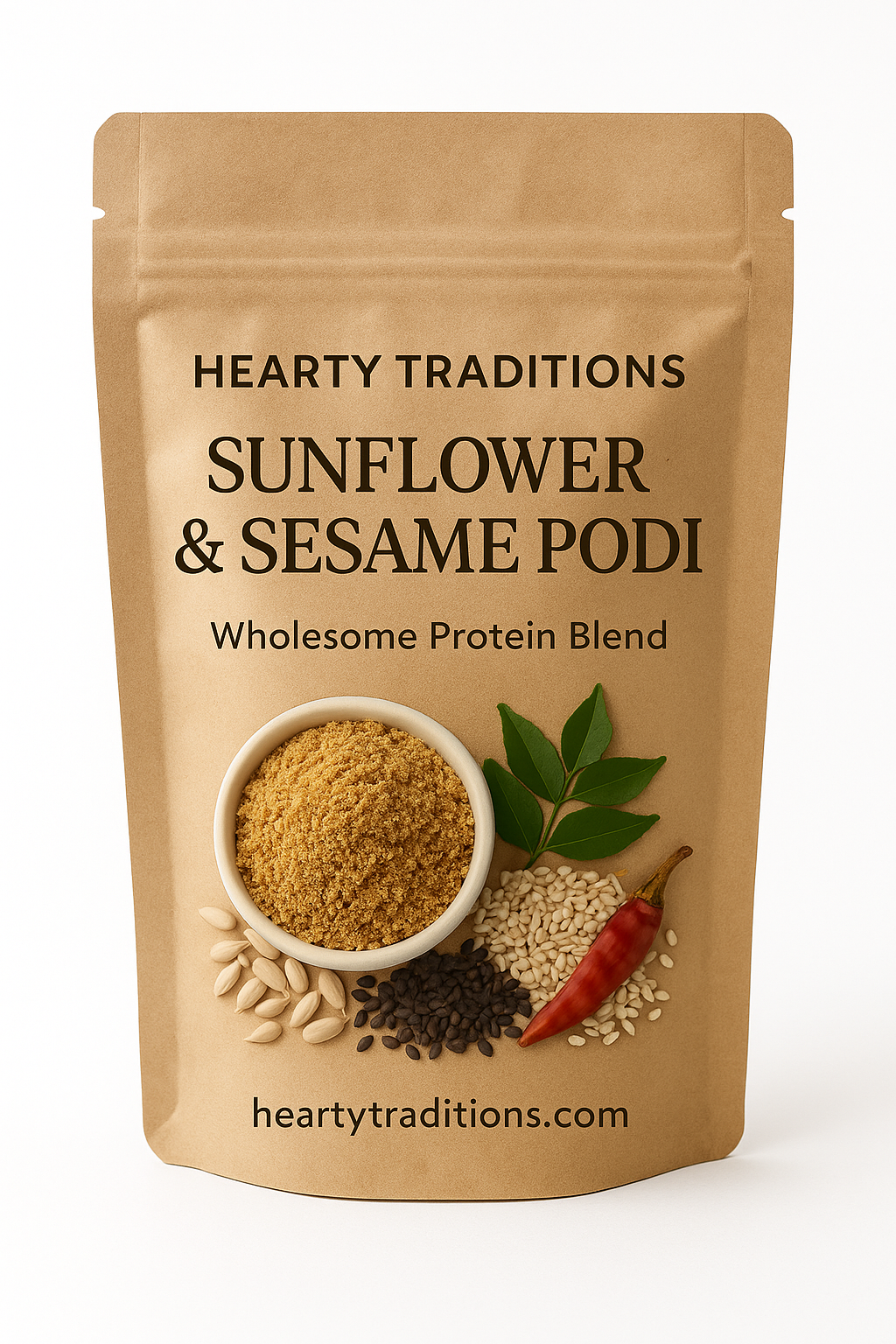 A wholesome mix of sesame and sunflower seeds, lightly roasted with spices for rich flavor and nourishment. Packed with minerals and healthy fats, it’s the perfect companion for idlis, dosas, or warm rice with ghee.