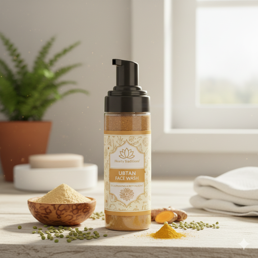 Hearty Traditions Ubtan Face Wash – A gentle, natural blend enriched with turmeric, neem, tulsi, and saffron. Packed in a sleek transparent bottle, this mild yellow cleanser brings the age-old goodness of Ubtan to modern skincare, leaving your skin fresh, glowing, and nourished.